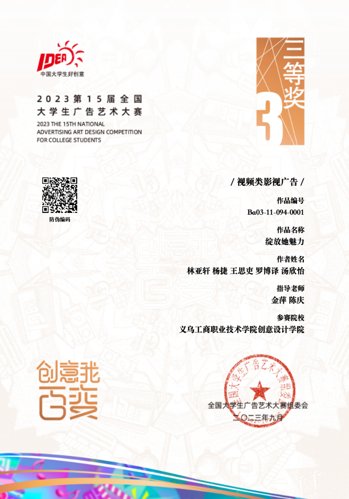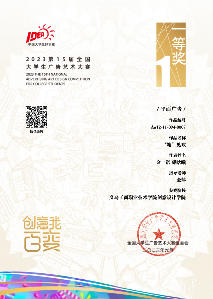 近日,2023年第十五届“全国大学生广告艺术大赛”成绩正式揭晓,ballBET贝博BB艾弗森数字媒体艺术设计专业学子在学院教师的指导下,斩获一等奖1项,三等奖1项。其中,学生金一诺,薛晗曦创作的《“箱”见欢》(指导老师:金萍)荣获平面广告类一等奖;林亚轩、杨捷、王思吏、罗博译、汤欣怡创作的《绽放她的魅力》(指导老师:金萍、陈庆)荣获视频类三等奖。