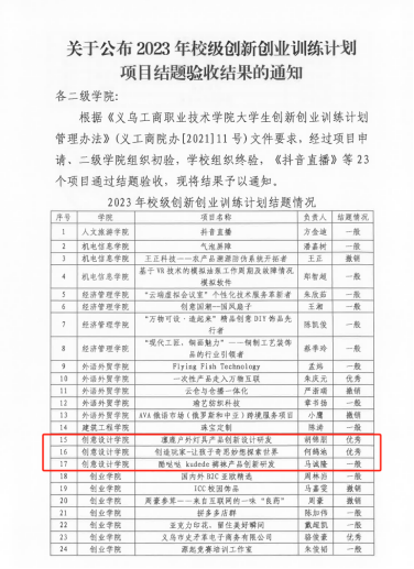 近日,学校发布了《关于公布2023年校级创新创业训练计划项目结题验收结果的通知》,贝博官网三个校级创新创业训练计划项目顺利通过结题验收。其中,《凛鹿户外灯具产品创新设计研发》和《创造玩家——让孩子奇思妙想探索世界》项目结题等级为“优秀”。