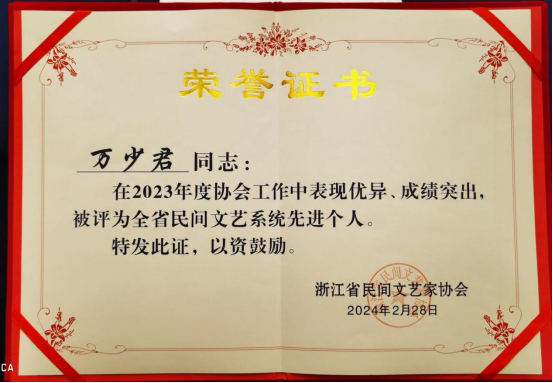 据悉,此次金华共有2家单位4名个人获2023年度省民协先进表彰。对于荣获此次表彰,万少君表示,未来将持续深入学习贯彻习近平文化思想和习近平总书记在文化传承发展座谈会上的重要讲话、考察浙江时重要讲话精神,积极开展丰富多元的民间文艺活动,为促进民间文艺创作繁荣等工作贡献力量。